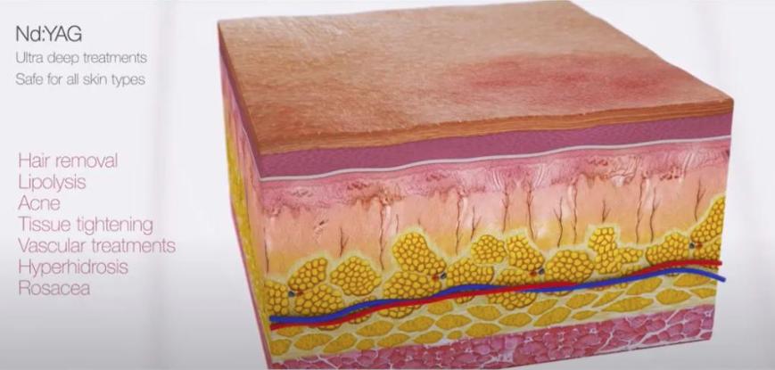 Step3: 1064nm ND: YAG Stringimento della pelle laser: questo laser può penetrare nella superficie della pelle e andare in profondità negli strati della pelle per stimolare la produzione di collagene e migliorare il tono della pelle. ND: Laser YAG può anche essere usato per alleviare le vene varicose e altri problemi vascolari.