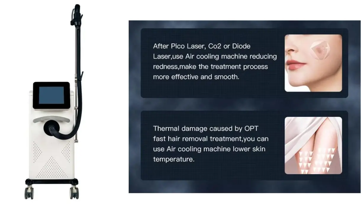 1) Fornisce continuamente aria di raffreddamento al tessuto bersaglio, minimizzando il dolore e il danno termico durante i trattamenti laser e IPL e fornendo un sollievo temporaneo per le iniezioni cosmetiche.