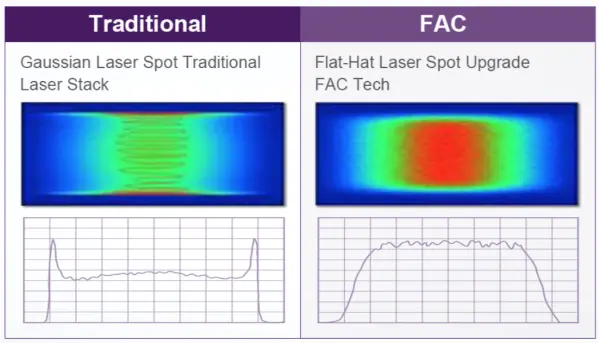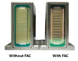 I laser a diodi sono generalmente inefficienti a causa dell'elevata divergenza asimmetrica, in particolare nell'asse veloce. La tecnologia FAC risolve questo problema posizionando una lente cilindrica ad alta apertura numerica (NA≈0,8) direttamente davanti all'emettitore laser, creando un raggio collimato ad alta intensità